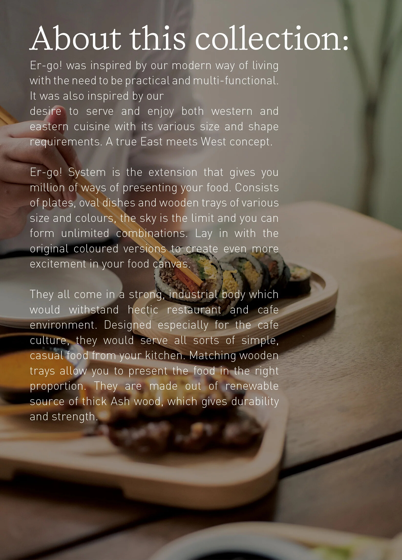 - Модульная система Er-go!: Поднос специально спроектирован так, чтобы на нем идеально размещались определенные элементы посуды из этой же коллекции. Это позволяет создавать аккуратные сеты для подачи кофе с небольшим десертом или стаканом воды.